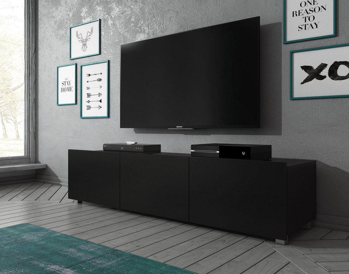 Meubella TV-Meubel Calgary Mat 150 cm Staand of Hangend is een verfijnd designmeubel waarmee je je huis omtovert tot een stijlvolle ruimte. Het meubel is gemaakt van stevig materiaal en heeft een matte zwarte uitvoering. Op het meubel bevinden zich drie deuren waarin je al je apparaten en accessoires kunt opbergen. Je krijgt bij de installatie de optie om het meubel staand of hangend te monteren. Het meubel is gemakkelijk te monteren omdat het wordt geleverd met losse pootjes en los ophangmateriaal. De verstelbare pootjes geven je de mogelijkheid om het meubel op elke gewenste hoogte te plaatsen. De stevige constructie en het stijlvolle design maken dit meubel geschikt voor elk interieur.